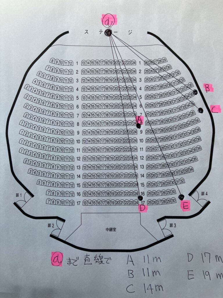 画像で言いますと座席表の席から、舞台中央ピンクの部分@地点にトップが立っているところで計測しましたので想定ください。